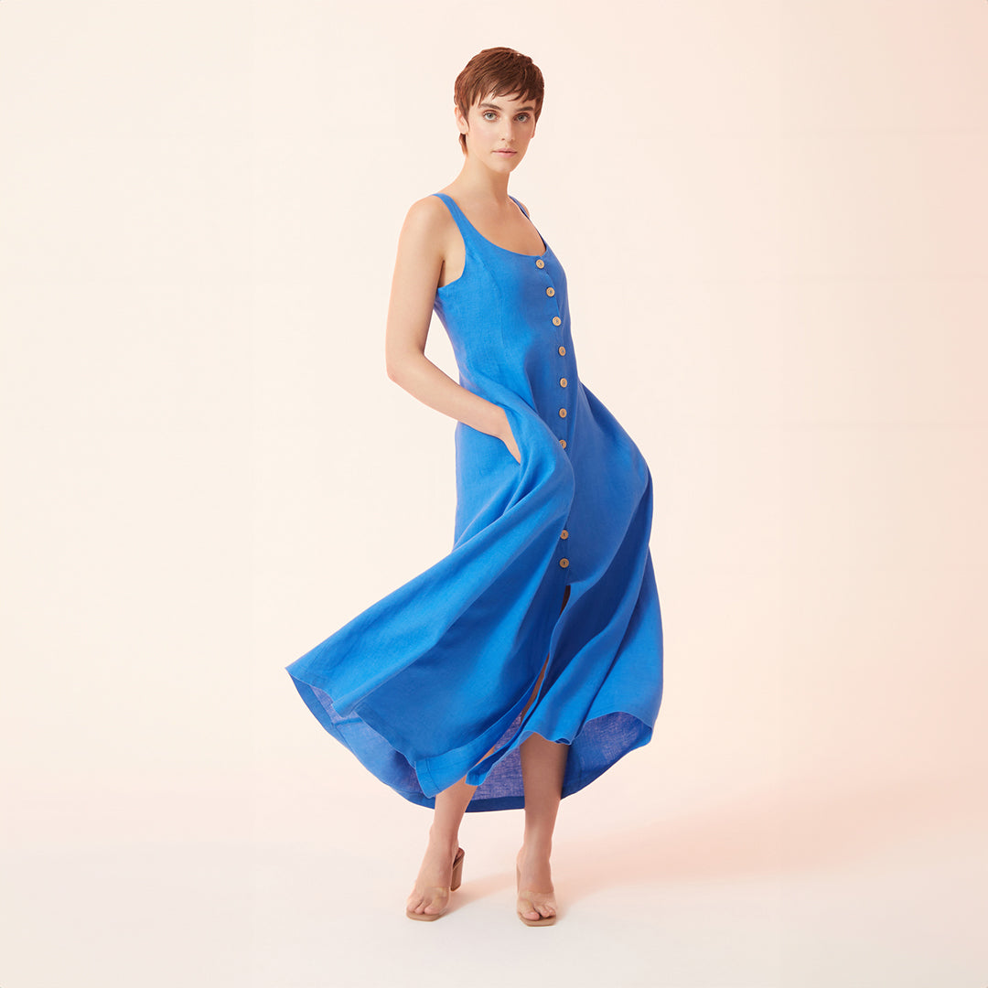 Sax Mavi Keten Önü Düğmeli Askılı Maxi Elbise